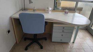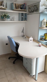 come da foto vendo scrivania completa con pensili, mensole, libreria, etc... La parte sottostante la scrivania è estraibile e la cassettiera si può posizionare con allungo in legno bianco girevole ad L come estensione della stessa