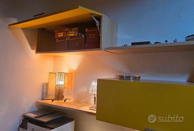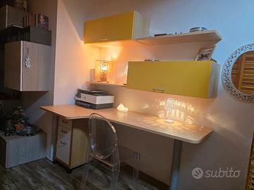 Scrivania libreria comprensiva di 2 pensili lunghi 90 cm l'uno, 2 mensole e un piano di lavoro da ben 180x90 cm con piedistallo, legno di alta qualità dal peso importante, non è un prodotto Ikea per intenderci. In buono stato, utilizzata pochissimo.