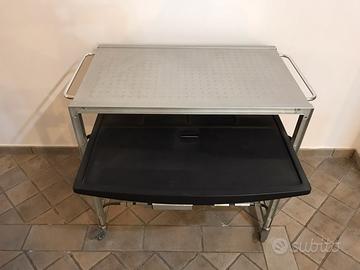 Scrivania con ripiani scorrevoli per computer e tastiera. Marchio e design Ycami Edizioni. Interamente in alluminio con ruote pivotanti sulle 4 gambe d’appoggio. Dimensioni: Larghezza 88 cm Profondità 54 cm Altezza 83 cm