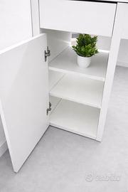 È dotata di cassetti e mensole interne, ideali per organizzare documenti e oggetti da ufficio. Dispone inoltre di un foro passacavi, perfetto per mantenere la postazione ordinata e senza fili in vista.
