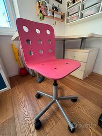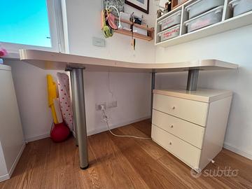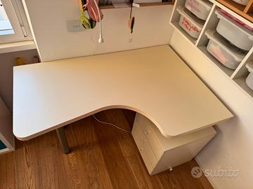 Vendo scrivania angolare bianca con sedia con ruote e regolabile in altezza. Misure scrivania: Largezza 136cm Profondità massima 90cm (angolo a dx) Profondità minima 64cm (angolo a sx) Altezza 77cm Misure cassettiera integrata:45x47x55h cm Scrivania con i suoi anni ma molto robusta e perfettamente funzionante. Sedia Ikea per bambini regolabile in altezza e con rotelle. Colore rosa. Perfettamente funzinante con qualche segbo d’uso. Cedo per cambio progetto di camrera. Cedo in blocco a prezzo simbolico di 10 euro per urgenza. Si vende gia smontata. Qualsiasi prova.