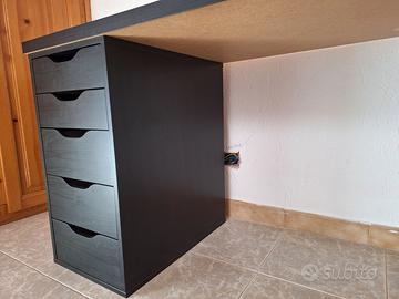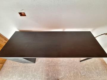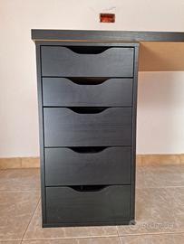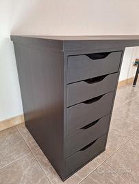 Scrivania Ikea con cassettiera, usata ma in condizioni praticamente perfette, se si escludono piccoli segni di usura nella parte di appoggio delle mani. È stata da me utilizzata in studio, per il computer e i vari accessori per il lavoro. È composta dai seguenti elementi: - piano tavolo LAGKAPTEN, misure 180(L)x60(P) cm; - cassettiera ALEX, misure 36(L)x70(H)x60(P) cm; - 3 gambe ADILS, H min 70 cm. Il colore è marrone-nero, le gambe sono nere. Questo modello di scrivania, la cassettiera e le gambe sono tuttora presenti nel listino Ikea (vi invito a verificare sul sito), e il set completo ha un prezzo attuale di € 155. L'oggetto è visibile, previo appuntamento, a Valpelline. Non ne prevedo la spedizione, ma solo la consegna diretta di persona. La cassettiera viene consegnata già montata (con un notevole risparmio di tempo!), mentre sarà necessario assemblare il piano tavolo e le gambe (meno di mezz'ora). Sono disponibile per qualunque informazione.