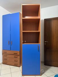 Scrivania in legno color ciliegio con cassettiera a 2 cassetti e libreria coordinata. Ottima per studio, smart working o cameretta. Struttura solida, piano ampio e comodo per PC o libri. Libreria con più ripiani capienti.