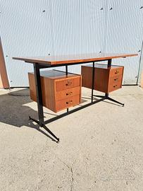 Scrivania con 6 cassetti in legno impiallacciato teak con struttura in metallo nero e piedini in ottone. Pratica postazione di studio o lavoro dal fascino vintage anni 70. Buone condizioni generali con struttura solida e cassetti scorrevoli, sono presenti piccoli segni di utilizzo e degli anni, si evidenzia che non c'è la chiave dei cassetti.