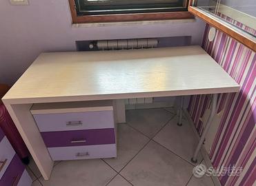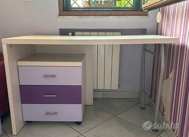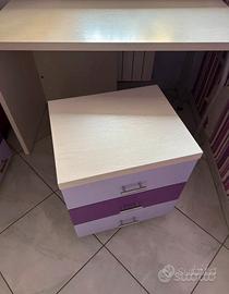 Vendo scrivania per mancato utilizzo, composta da comodino estraibile con 3 cassetti. Colorazione legno bianco con 2 cassetti lilla e 1 viola