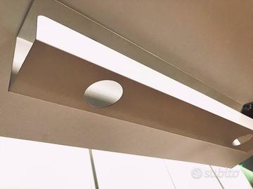 Sotto la scrivania vi è un contenitore di metallo con 2 buchi passacavo, utilissimo per contenere/nascondere una eventuale ciabatta multipresa per il collegamento elettrico di tutti gli elementi sulla scrivania.