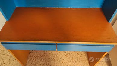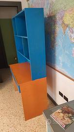 scrivania arancione e celeste 1mt per 48 cm,due cassetti e libreria. Altezza scrivania 75 cm Libreria altezza 1mt