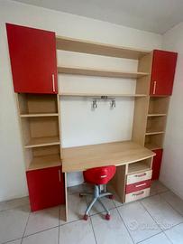 Vendo scrivania in legno chiaro con dettagli rossi, completa di libreria, sedia girevole ed illuminazione.