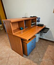 Scrivania da ufficio con cassettiera con rotelle e chiusura a chiave in legno di ciliegio e azzurro. carrello per tastiera computer a scomparsa. misure : lunghezza 140x 83x h. 111 cm. Smontaggio e ritiro a carico dell'acquirente.