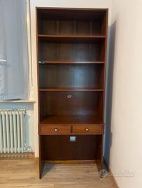 Scrivania color nocciola con 3 ripiani e 2 cassetti.