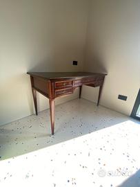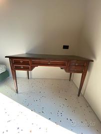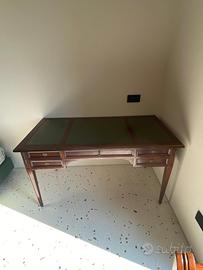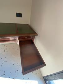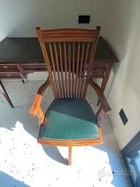 Scrivania con ripiano in pelle e sedia ufficio reclinabile in vero legno. 5 ampi e profondi cassetti di cui uno con serratura. Qualche segno del tempo ma oggetto ancora di grande valore e stile per un ufficio o studio di classe.