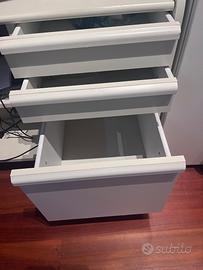 Scrivania in legno bianco larghezza 1 m Profondità 52 cm Altezza 78,5 cm Tre cassetti molto contenitivi, secondo piano scorrevole e ruote massicce con freno. Non è legno Ikea