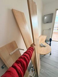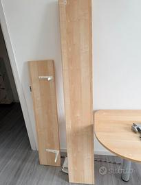 Si vende come da foto scrivania in legno con sedia blu con ruote, 3 mensole con staffe e viti, in ottime condizioni come nuovo. Misure: 170 L, Profndità minima 41, massima 68 Per informazioni contattatemi in privato. Prezzo leggermente trattabile.