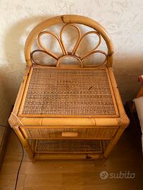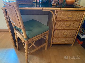 scrivania e sedia + comodino in vimini vendibili separatamente ritiro a domicilio no perditempo misure scrivania: altezza 78 cm Profondità 60 cm Larghezza 1.20 cm Comodino Alt 50 cm con decorazione 75 cm Profondità 39 cm Larghezza 48 cm