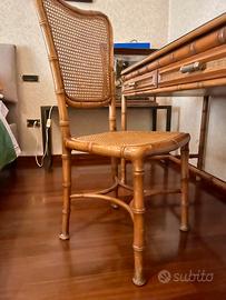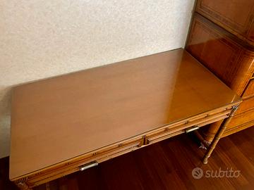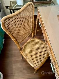 Scrivania in legno e rattan con ripiano in vetro + seduta legno e rattan, dimensioni: larghezza 1,25 m x h 0,78 cm x profonditá 0,62 cm.