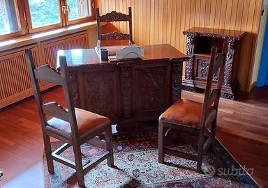Scrivania con 3 sedie in legno e pelle (1 principale con braccioli e 2 frontali) e consolle, ottime condizioni. Ritiro a mano. Dimensioni scrivania: 145 cm x 75 cm x Altezza 80cm. Sedie 50cm x 50cm per 120cm di altezza. La consolle (ultima foto) è 80cm x 40cm x altezza 90cm.