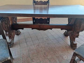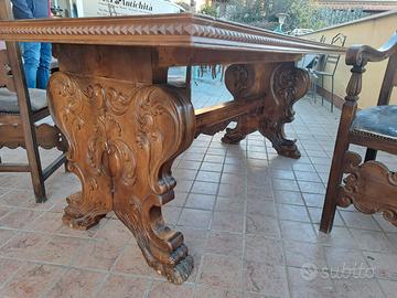 scrivania italiana rinascimentale in noce con sedia braccioli e due sedie lato clienti il prezzo prevede la tappezzeria nuova su tutte le sedie sempre in pelle misure scrivania 190x90 altezza 78...M&P Antichità siamo un negozio specializzato in antiquariato vintage e shabby vendita al dettaglio e all ingrosso scarichi settimanali oltre 500 articoli in negozio, abbiamo una vasta scelta di como comodini tolette armadi letti vetrine vetrinette credenze servanti angoliere librerie tavoli tavolinetti sedie poltrone poltroncine divani lampade lampadari tappeti scrivanie scrittoi secretere ribaltine consolle quadri cornici specchi cassapanche bauli oggettistica varia idee regalo e molto altro ci troviamo a Roma zona Castelverde via Massa San giuliano 26b POSSIBILITÀ DI CONSEGNA E SPEDIZIONE IN TUTTA ITALIA