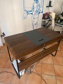 Scrivania multifunzione dal design moderno in legno scuro, con ampio vano contenitore centrale e pratico piano scorrevole. Ideale per ufficio, studio o casa.