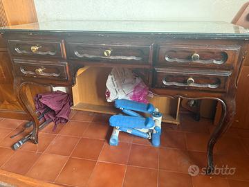 Scrivania in color mogano con dettagli dorati. La superficie è coperta da vetro su misura spesso ma rimovibile. Ritiro in zona Tiburtina.