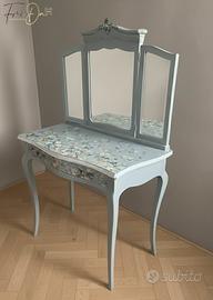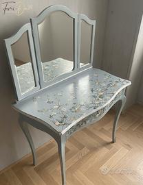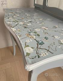 Consolle scrivania con speccchio dipinta a mano colore azzurro cenere con applicazione di transfer floreali (Redesign with prima) cera argento passata a mano sui profili e fregi in metallo anch’essi rinnovati con cera argento. Realizzato da Fri.Da Crearions Misure cm 96x52x150