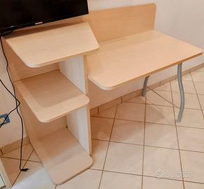 Bellissima scrivania d'arredo per cameretta o ufficio. E' composta da un piano di lavoro 100 x 60 cm. Altezza del piano lavoro 74 cm. Gambe in metallo verniciato. Sulla parte sinistra è situata una scaffalatura con due ripiani. Altezza totale 94 cm. Un pannello di fondo che copre il piano lavoro con un'altezza di circa 25 cm. Tutto in ottime condizioni. Per motivi di spazio, la scrivania è stata smontata.