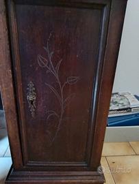 Scrivania antica in legno scuro con un alzatina e intagli floreali sulle ante. Rivestimento in pelle