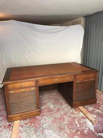 Grande scrivania depoca originale in legno massello con piano in vera pelle e serrandine scorrevoli che coprono i cassetti . Dimensioni 200 x 120 x 80