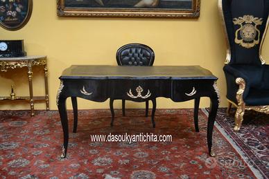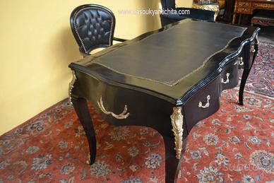 Bellissima scrivania presidenziale da centro stile Luigi XV in legno massello ebanizzato , provvista di tre cassetti cassetti lungo il grembiule e in cima alle gambe cabriolet, parte superiore con inserto in ecopelle nera, arricchita da ornamenti in bronzo cesellato e dorato..