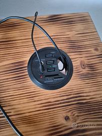 pannello di legno in cui è stato inserito un vetro per mostrare i componenti interni (alcuni RGB). 2 ripiani laterati per vari accessori (hard disk esterni e altro). gancio per le cuffie. supporto per il monitor. hub usb e lettore di schede, fa anche da passacavi per mouse e tastiera.