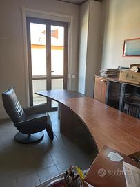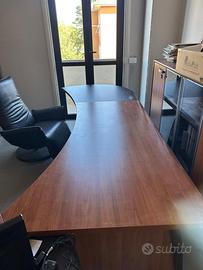 Scrivania da ufficio effetto legno in ottime condizioni, vendo per ridimensionamento locali. Composta da scrivania 200x90 e tavolino con ruote porta pc e casettiera.