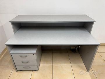 Scrivania colore grigio con piano ampio, alzata superiore e cassettiera a 3 cassetti con serratura.