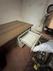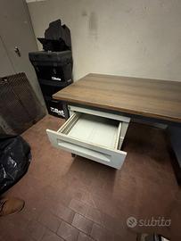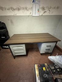 Scrivania robusta da 150 cm x 75 cm con piano effetto legno e doppia cassettiera in metallo. Ideale per uffici tecnici o ambienti industriali. Ampia superficie di lavoro e spazio contenitivo.