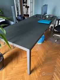 La scrivania ha gambe a seziona quadra in alluminio verniciato BRUNO OLIVA, piano tamburato sp. 50 mm, con finitura superiore in CRISTALLO NO PRINT GRIGIO (su tutto il perimetro del piano è applicato un profilo in