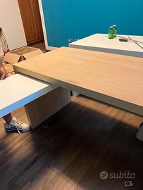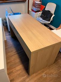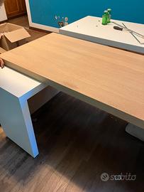 Scrivania in legno truciolato con mensola estraibile (con rotelle). Scrivania Formato 150x65 cm, altezza 72 cm. Mensola formato 60x40 cm. Disponibile in 2 colori: legno o laccato bianco. Comoda e versatile grazie alla possibilità di aumentare superficie grazie alla mensola. Ottimo stato.