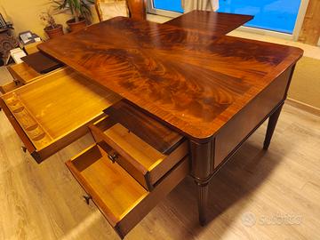 A sinistra e a destra da parte del proprietario la scrivania presenta in totale due piani estraibili d'appoggio ideale per carte e firme, in ugual modo c'è dalla parte opposta ovvero quella del "cliente" un singolo grande piano d'appoggio estraibile per eventuali firme ecc...
