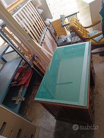 scrivania di legno con cassetti e piano di vetro