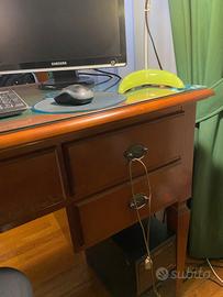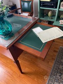 Vendo scrivania direttorio originale Morelato realizzata in legno di ciliegio con piano rivestito in pelle verde e due tiretti estraibili laterali, anch'essi rivestiti in pelle verde, per rendere il piano di lavoro piu ampio . Cinque cassetti di cui uno centrale (leggermente graffiato) e due al lato destro e due al lato sinistro. Dimensioni 140 x 70. Piano della scrivania pari al nuovo perchè è protetto da un cristallo. Magnifica poltroncina classica a marchio Morelato, pregiata ebanisteria italiana. Stile Direttorio. Struttura in legno di ciliegio e rivestimento in pelle verde. Molto comoda e ben rivestita, girevole a 360 gradi. In ottime condizioni.