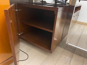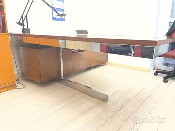 Scrivania direzionale di grande effetto a L, in legno massello di noce americano, con basamento metallico cromato, tenuta molto bene (quasi come nuova, acquistata originariamente nel 1979) dimensioni 220 x 90 x 78h - scrivania laterale 180cm (parte esposta 103 x 53 x 58h). Composta da 2 ampi cassetti, un profondo classificatore, un vano portaoggetti frontale profondo 58 cm su due livelli. Completamente smontabile, eccetto la scrivania laterale 180x53x58. Pezzo d'epoca