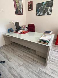 Scrivania direzionale angolare in ottime condizioni, piano in vetro satinato e struttura effetto legno chiaro.
