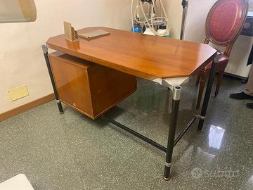 Scrivania dirigenziale disegnata da Luisa & Ico Parisi e prodotta da MIM (Mobili Italiani Moderni). La scrivania presenta 3 cassetti sul lato destro del tavolo: solo il cassetto superiore ha una serratura, ma grazie ad un semplice meccanismo con chiave blocca tutti i cassetti. La scrivania presenta una targhetta metallica MIM.