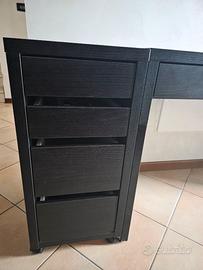 vendo scrivania e cassettiera colore marrone/nero in ottimo stato. il piano non presenta alcuna scheggiatura o segno di usura. La scrivania presenta un piccolo segno d'usura in basso sulla parte destra.