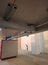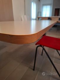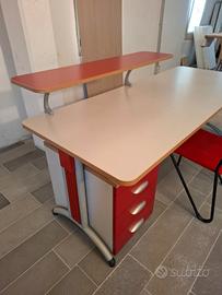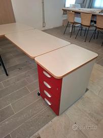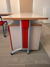Si tratta di una scrivania componibile con una robusta struttura in ferro e piani in legno. I piani hanno lo spessore di mm25, hanno il rivestimento in formica da entrambi i lati ed il rivestimento dei bordi in simil multistrato. Tutti i piedini si possono regolare in altezza. È disponibile anche una mensola rialzata da fissare al piano in qualsiasi posizione. La cassettiera esterna ha quattro piedini alla base, quella sotto alla scrivania si sposta sulle ruote. Entrambe sono provviste di chiave per la chiusura dei cassetti. Posso occuparmi della consegna. Dimensioni totali d'ingombro come foto: cm200, cm223. Altezza cm73. Dimensioni moduli: piano grande cm200, cm80; piano piccolo cm100, cm66; cassettiera esterna cm43, cm66, altezza cm73.