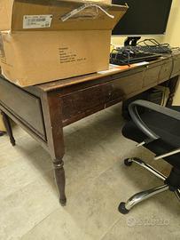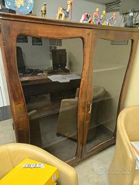 Libreria metà 900 con ante in vetro e tre ripiani in legno Scrivania primi del 900 molto particolare con piedi a cipolla , intarsiata nel davanti e due cassettoni uno scrivano