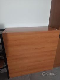 Scrivania da ufficio (180x60) in noce con cassettiera, alta cassapanca con apertura dall'alto, struttura in ferro con due cubi contenitori. Trasporto a carico dell'acquirente