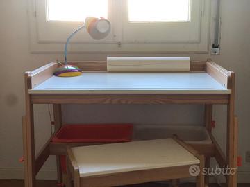 Vendiamo scrivania e panca regolabile in legno (vero) dell'Ikea, modello Flisat. La scrivania e la panca sono entrambe regolabili in altezza e adatte per gioco o studio per bambini e ragazzi dai 4 ai 13 anni ca. Regaliamo i contenitori, comodissimi, da inserire in basso, e un rullo di carta da disegno da tenere sulla scrivania per essere sempre a portata di mano.