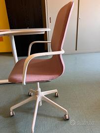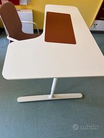 Scrivania Ikea angolare e regolabile in altezza con inserto raccogli fili. Venduta con tappetino e sedia Ikea con braccioli e con meccanismo di inclinazione e di regolazione in altezza. La sedia presenta dei graffi da usura alla base.