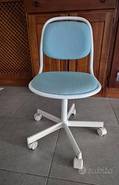 Scrivania in truciolare e fibra di legno con gamba in acciaio rivestito, colore bianco, con un cassetto dotato di fermo (per evitare che il cassetto venga estratto completamente) foro passacavi – la scrivania si può collocare anche al centro della stanza poiché il pannello di fondo è rifinito- sedia girevole con rotelle e altezza regolabile, seduta in tessuto azzurro il tutto in ottime condizioni, dimensioni come da foto.