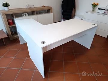 Vendo scrivania moderna da ufficio bianca molto comoda, dimensioni 160 cmq x145 cm h 76 cm con 2 buchi passacavi. Inclusa sedia da ufficio. tel 3345779662