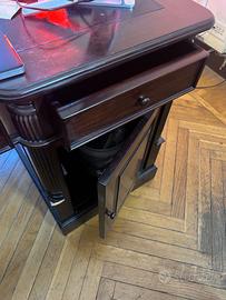 Scrivania in mogano massiccio stile università inglese con scrittoio bifacciale in eco pelle nera, 4 cassetti per lato più uno centrale, sul retro tre cassetti più due con sportelli. Misure 160X80X78. Eventualmente con due poltroncine in eco pelle rossa abbinate.