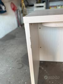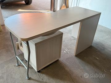 Scrivania molto robusta e pesante con parte estensibile. la cassettiera ha le rotelle e permette di ingrandire il piano di appoggio diventando a L